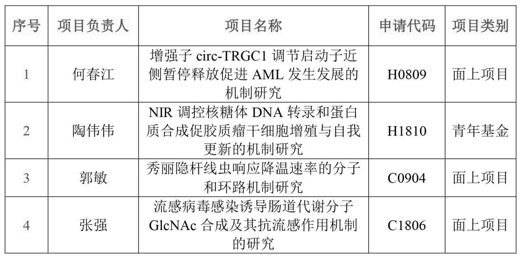 近日,2021年度国家自然科学基金申请项目评审结果公布。公司集中受理期共获批国家自然科学基金4项,其中面上项目3项、青年科学基金项目1项,分布在国家自然科学基金委的生命科学部2项、医学科学部2项,具体如下: