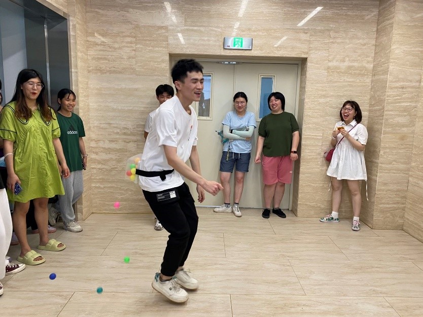 “中了!中了!”套圈的项目场地上,大家齐声喊道。由金红林、汤子建、李瓅、李礼四个课题组联合举行的师生游园会正在如火如荼的进行中。“左,右,左,右……”在另一侧,随着口令起起落落,两人三足的游戏也进入了高潮,“这个项目很考验两人的默契程度,并且随机组队,也可以认识不同的课题组的员工,增强了大家之间的交流。”金红林老师表示,在此活动中以一种更为轻松有趣的形式与员工深入交流,在体验趣味活动的同时也促进了师生之间相互学习、共同配合。