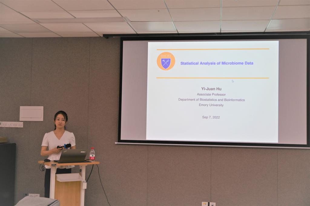 在学术交流环节,来自美国埃默里公共卫生公司的胡懿娟老师以“微生物组数据的统计分析”为题做学术报告。她表示微生物群落的差异与许多疾病有关,而微生物组是建立新的疾病诊断和预后生物标志物以及开发低成本、低风险干预措施的有力对象。她们提出了一种基于线性回归的新方法,该方法考虑了微生物组数据的所有特征,以对差异丰度进行稳健测试,能普遍控制错误发现率,又同时保持高功率。她们用了五个不同的微生物组数据集来展现该方法的广泛应用。
