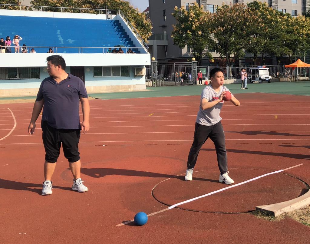 除了百米赛跑外,李礼老师还报名了教职工男子组实心球前抛项目。跑道旁边,他正与郭敏老师正在拉伸训练,准备大展身手。随着一道道优美的抛物线从空中划过,沉甸甸的实心球一次比一次投掷的更远。在激烈的角逐中,郭敏老师和李礼老师分别荣获第六、七名。
