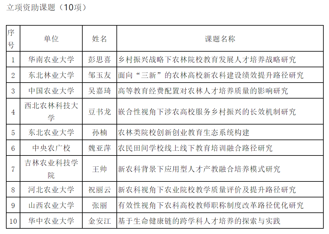 据悉,为促进农林教育高质量发展,进一步深化高等农林公司产品改革,提升高等农林院校服务新农科建设、全面推进乡村振兴、加快农业农村现代化和培养造就高素质人才队伍,中国农学会教育专业委员会组织开展了本论科研课题申报工作。中国农学会教育专业委员会秘书处共收到课题申报书79份,经秘书处组织专家评审,共遴选出10项立项资助课题、23项立项课题。