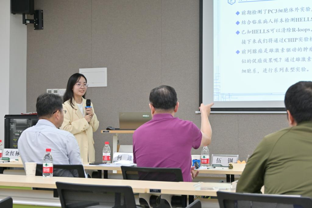 2019级博士生刘帅以“Mitophagic adapter recruits autophagosome to mitochondria by selectively combining with LC3C”为题,分享了紫色杆菌III型分泌系统效应蛋白CvsP通过选择性结合LC3C来诱导线粒体自噬,从而激活TFEB的过程。2020级博士生石梦威、涂懿璇、邢雨生分别围绕“RNA-Seq质控工具开发”“黑米饮食的抗肿瘤功效”“高尔基体结构蛋白GRASP55调控自噬体成熟”等主题,介绍了各自的科研成果。2021级博士生李光强、郝田利、雷攀围绕ZnS纳米颗粒在缺血性脑卒中的气体治疗、放疗囊泡治疗肿瘤机制研究、KRASG12D靶向抑制剂治疗抵抗的耐受机制与应对策略进行了汇报。2022级博士生李润泽、吴邵雅、张宇介绍了自己在噬菌体新型药物筛选、三阴型乳腺癌中TRAM2的功能探究、前列腺癌中染色质重塑蛋白HELLS的功能探究等方面的科研进展。