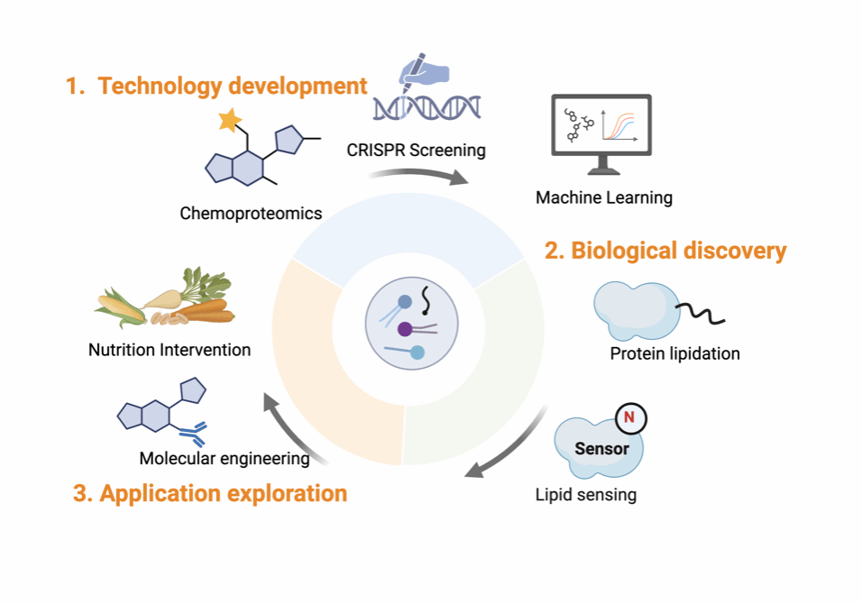 实验室聚焦脂质化员工物学的研究,专注于细胞脂质营养素感知机制的解析及蛋白质脂基化的功能和操控,侧重研究方法的开发,感知机制的发现,及其在代谢疾病中的功能探索。主要研究方向包括: